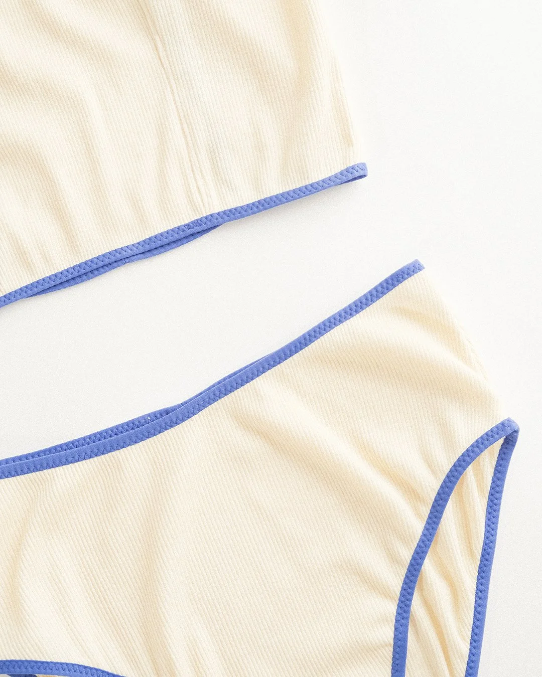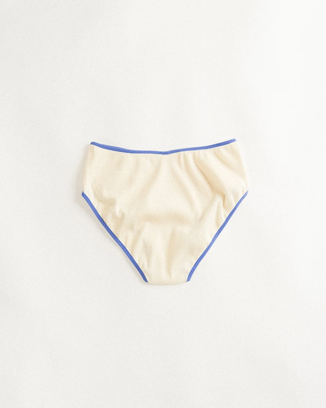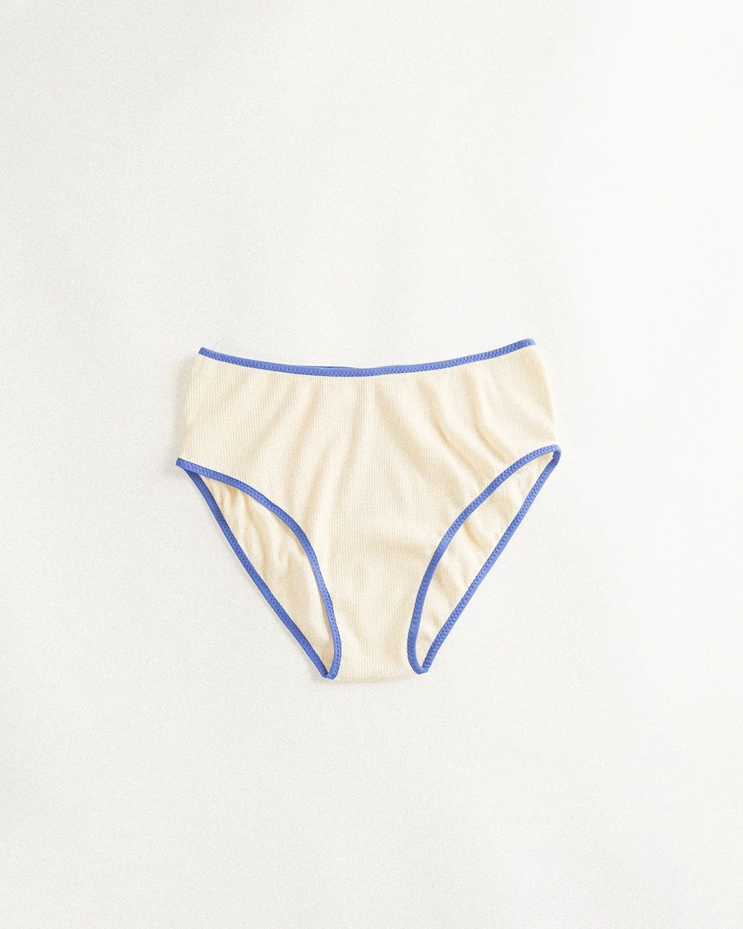 Ale slip is made of ivory ribbed jersey cotton with blue elastic profiles.